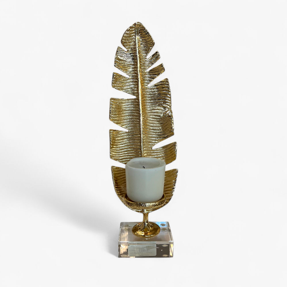 Esta figura decorativa con forma de hoja de palma y base en acrílico eleva cualquier espacio con su brillo sofisticado. Ideal para resaltar mesas, consolas o rincones especiales, incluye soporte para vela que suma calidez al diseño. Pura elegancia con inspiración natural.